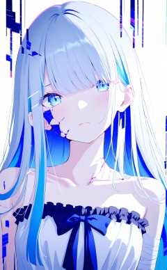 masterpiece,best quality,high quality,1girl,solo,bandages,bandaged arm,long hair,glitch,blue eyes,looking at viewer,dress,colored inner hair,collarbone,closed mouth,white hair,blue theme,cracked skin,frilled dress,white background,bow,frills,upper body,head tilt,white dress,multicolored hair,hand up,blue hair,expressionless,crack,simple background,one eye covered,bare shoulders,straight hair,blue bow,straight-on,hair behind ear,strapless dress,