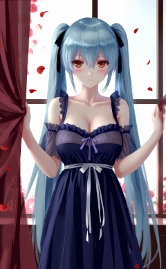 (masterpiece),(best quality),illustration,ultra detailed,hdr,Depth of field,(colorful),loli,[Artist:wlop],[[Artist:sheya]],Artist:hiten_(hitenkei),mmd,hanfu,Artist:inugami kira,1girl,solo,dress,twintails,black dress,breasts,curtains,flower,frills,rose,frilled dress,long hair,looking at viewer,red flower,window,ribbon,grey hair,red rose,curtain grab,bare shoulders,black ribbon,hair ribbon,petals,hair between eyes,closed mouth,large breasts,short sleeves,blush,cowboy shot,brown eyes,indoors,sleeveless dress,standing,collarbone,bow,very long hair,cleavage,see-through,