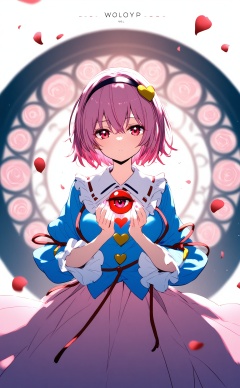 masterpiece,best quality,high quality,nai3 Style,1girl,komeiji satori,solo,hairband,heart,shirt,blue shirt,third eye,black hairband,skirt,wide sleeves,short hair,long sleeves,pink skirt,frills,frilled shirt collar,petals,heart hair ornament,pink hair,hair between eyes,rose,frilled sleeves,rose petals,stained glass,looking at viewer,pink eyes,flower,hair ornament,breasts,pink rose,pink flower,ribbon-trimmed collar,medium breasts,blouse,cowboy shot,red eyes,buttons,closed mouth,heart button,character name,eyeball,hands up,red rose,ribbon trim,blurry,expressionless,pink nails,