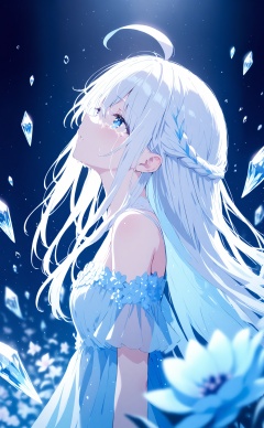masterpiece,best quality,high quality,(colorful),1girl,flower,solo,dress,braid,looking up,blue flower,white dress,long hair,white hair,from side,blue eyes,bare shoulders,crying,blurry foreground,standing,blurry,sidelocks,crying with eyes open,blue theme,ahoge,tears,crystal,profile,depth of field,off shoulder,breasts,small breasts,off-shoulder dress,light,