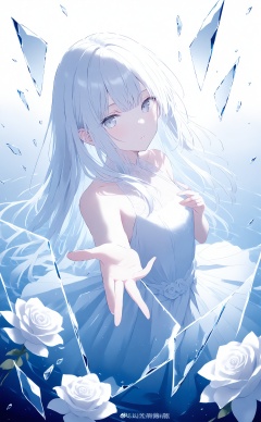 masterpiece,1girl,solo,long hair,dress,looking at viewer,white eyes,glass,grey eyes,white dress,white hair,broken glass,flower,white theme,bare shoulders,blue theme,dress flower,glass shards,white flower,reaching,reaching towards viewer,water,parted lips,closed mouth,sleeveless,reflection,sleeveless dress,white rose,watermark,expressionless,