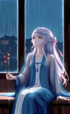 (masterpiece),(best quality),illustration,ultra detailed,hdr,Depth of field,(colorful),loli,[Artist:wlop],[[Artist:sheya]],Artist:hiten_(hitenkei),mmd,hanfu,1girl,loli,solo,green eyes,chinese clothes,rain,flower,window,night,wide sleeves,ribbon,long sleeves,grey hair,long hair,hair ribbon,indoors,branch,collarbone,looking up,holding,sitting,closed mouth,