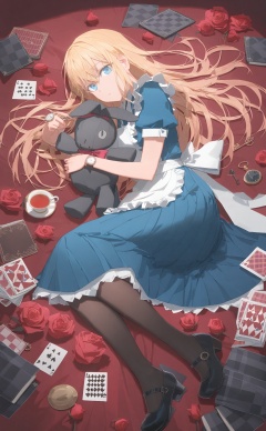 masterpiece,best quality,Artist free style (yohan1754),1girl,stuffed toy,solo,stuffed animal,blonde hair,long hair,blue eyes,watch,stuffed rabbit,key,card,alice (alice in wonderland),pocket watch,cup,lying,flower,pantyhose,dress,playing card,looking at viewer,rose,apron,teacup,blue dress,mary janes,book,shoes,black footwear,on side,food,red flower,short sleeves,