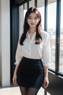 <lora:0827_01:0.7>simple background, (global illumination, reality, ray tracing, HDR, unreal rendering, reasonable design, high detail, masterpiece, best quality, ultra high definition, movie lighting),1girl,solo,smile,realistic,looking at viewer,long hair,makeup,upper body,<lora:z_Cloth_SenLuo_office lady_1_KEEPCHAR_1_DEFACE:0.55>,upper body,office lady,white shirt,black skirt,pencil skirt,pantyhose,white skin,pale skin,cinematic_lighting,frontlight,Volumetric Lighting,(EOS R8,50mm,F1.2,8K,RAW photo,,, 1girl,realistic,masterpiece, best quality, photorealistic, HDR,detail
