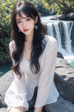 1girl, bare tree, black hair, branch, breasts, day, dress, earrings, forest, jewelry, lake, long hair, long sleeves, lying, medium breasts, nature, necklace, outdoors, palm tree, rock, solo, tree, waterfall, white dress  <lora:1.0:0.66>