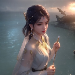<lora:眷思量-须灵犀-V2:0.8>, (,1girl, ,best quality, ),looking at viewer, ,ultra detailed 8k cg, ultra detailed background, ultra realistic 8k cg,  ,masterpiece((((1girl, solo,  , ,solo focus, wet,sweat, ocean,rain, water drop, )))) (, , sweatdrop, flying sweatdrops, sweating profusely,colorful drop \(module\), )   clean, masterpiece,     cinematic lighting, cinematic bloom,   , unreal, science fiction, luxury, jewelry, diamond, gold, pearl, gem, sapphire, ruby, emerald, intricate detail, delicate pattern, charming, alluring, seductive, erotic, enchanting, hair ornament, necklace, earrings, bracelet, armlet,halo,