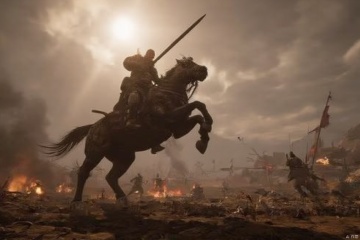 Create a dynamic 3A-quality video game scene featuring a massive, armored warrior on a charging warhorse, wielding a gleaming sword. The setting is a vast, open battlefield with dramatic, sweeping camera angles. The lighting is intense, with sun rays piercing through the clouds, casting dramatic shadows. The warrior's expression is fierce, embodying the spirit of 金戈铁马!气吞山河! The composition emphasizes the scale and power of the warrior and horse, with distant armies clashing in the background.