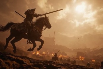 Create a dynamic 3A-quality video game scene featuring a massive, armored warrior on a charging warhorse, wielding a gleaming sword. The setting is a vast, open battlefield with dramatic, sweeping camera angles. The lighting is intense, with sun rays piercing through the clouds, casting dramatic shadows. The warrior's expression is fierce, embodying the spirit of 金戈铁马!气吞山河! The composition emphasizes the scale and power of the warrior and horse, with distant armies clashing in the background.