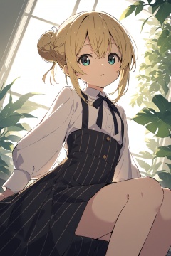 1girl, solo, skirt, blonde hair, sitting, shirt, striped skirt, black skirt, white shirt, long sleeves, vertical-striped skirt, striped, vertical stripes, bangs, long hair, braid, backlighting, sidelocks, window, plant, dutch angle, looking at viewer, blue eyes, parted lips, single hair bun, hair bun, high-waist skirt, green eyes, long skirt, blouse, hair between eyes, pinstripe pattern
