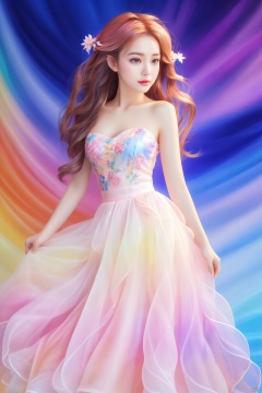 HD, best quality, 8K,1girl, keaiqunzi, big breasts, stars in the sky, fluorescent art, super-realistic girl photography from fairy tales, long flowing hair, exquisite facial features, peaceful expression, flowing long skirt, one-shoulder long skirt , starry headband, rainbow background, the artist uses impasto and cream landscape portrait style on the photo, blending Chinese meticulous painting and modern dopamine art to present a unique magazine style