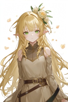 solo, 1girl, long hair, flower, blonde hair, hair flower, hair ornament, pointy ears, green eyes, braid, belt, looking at viewer, weapon, bare shoulders, elf, petals, white background