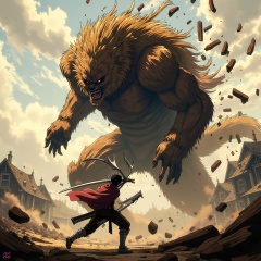 titanara, digital drawing in the anime style, A dramatic showdown between Levi and the Beast Titan on the outskirts of a destroyed village. Levi is mid-attack, spinning rapidly with his blades aimed at the Beast Titan’s nape. The Beast Titan, towering and covered in fur, has just hurled a barrage of debris with incredible force, but Levi’s agility allows him to dodge and close in for the kill. The background shows the aftermath of battle, with shattered buildings and scattered corpses. The lighting is harsh, with the sun low on the horizon, casting long shadows and highlighting the tension of the scene.