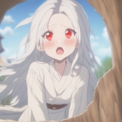 red eyes, niji-style-1, solo, long hair, blush, looking at viewer, 1girl, open mouth, white hair, upper body, blurry