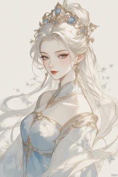 1girl, solo, long hair, breasts, looking at viewer, dress, bare shoulders, jewelry, upper body, white hair, earrings, small breasts, parted lips, detached sleeves, grey eyes, tiara, crown, snowflakes,gurenyun