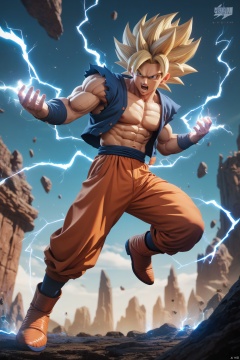 super saiyan, 1boy, male focus, blonde hair, solo, open mouth, aura, son goku, super saiyan 1, electricity, spiked hair, dougi, boots, full body, wristband, watermark, muscular, son gohan,
