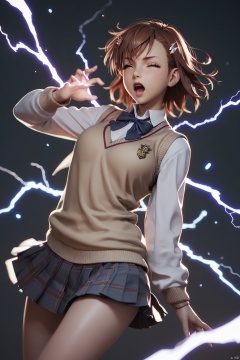 1girl, misaka mikoto, tokiwadai school uniform, solo, school uniform, brown hair, one eye closed, electricity, hair ornament, brown eyes, skirt, electrokinesis, hairpin, sweater vest, short hair, open mouth,