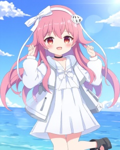 <lora:flux-ty:1.8>,Artist_tyomimas,loli,1girl,Artist Tyomimas, Loli, 1 Girl, :D, Black Choker, Black Footwear, Blue Neckertie, Blue Sky, Blush, Bow, Choker, Cloud, Collarbone, Commission, Cowboy Shot, Crescent, Crescent Hair Ornament, Cross, Cross-Shaped Pupils, Cross Choker, Dot Nose, Dress, Dutch Angle, Hair Bow, Hair Ornament, Hairband, Hands Up, Highres, Hood, Hood Down, Hooded Jacket, Horizon, Jacket, Lens Flare, Long Bangs, Long Sleeves, Neckertie, Ocean, Open Clothes, Open Hands, Open Jacket, Open Mouth, Original, Platform Footwear, Platform Heels, Pleated Dress, Raised Eyebrows, Red Eyes, Sailor Dress, Sidelocks, Skb Commission, Sky, Sleeve Cuffs, Smile, Solo, Symbol-Shaped Pupils, Thigh Gap, Two Side Up, Tyomimas, Variant Set, White Bow, White Dress, White Hairband, White Jacket