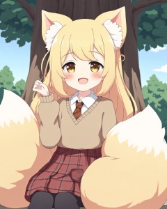 <lora:flux-ty:1.8>,Artist_tyomimas,loli,1girl,Artist Tyomimas, Loli,  a virtual character with blonde hair and brown eyes, wearing a brown sweater over a white shirt, paired with a plaid skirt and black pantyhose. the character has animal ears, specifically fox ears, and fox tail, giving her a cute and playful look. she also has long hair with animal ear fluff, enhancing her fox-like appearance. the character is depicted sitting and looking directly at the viewer, holding her own tail in a friendly manner. the background features a tree, suggesting an outdoor setting. the tags 'commission' and 'skeb_commission' indicate that this artwork might be a custom request for a fan or collector. the 'original' tag suggests that this character design is unique and not based on any existing character. overall, this character embodies a cute, playful, and friendly persona, typical of virtual characters with animal ears.