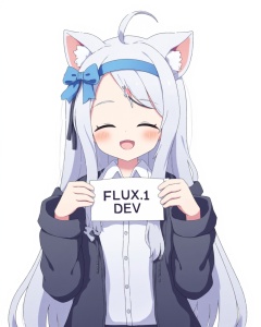 <lora:flux-ty:1.8>,Artist_tyomimas,loli,1girl,Artist Tyomimas, Loli, a single girl with sleeves extending past her wrists, faces the viewer. she sports animal ears and closed eyes, donning a white shirt against a white backdrop. her grey hair is adorned with a cat ear headband, and she smiles while holding a bow, exhibiting blush stickers and a hair ornament. wearing a hood that's down, she also has a blue bow in her long hair. clad in a black jacket over a collared shirt, the setting features a simple background. she holds up a sign with the text "FLUX.1 DEV", her hair parted between her eyes, secured by a hairclip. with long sleeves reaching past her fingers, her mouth is open, and the image focuses on her upper body. a sense of playfulness is captured in her ":d" expression, emphasized by the sign she's holding, and her hooded jacket rests open, revealing a hint of blush. whiskers accentuate her cat-like appearance, and her clothes are slightly open, adding to the casual charm.