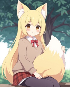 <lora:flux-ty:1.8>,Artist_tyomimas,loli,1girl,Artist Tyomimas, Loli, a virtual character with blonde hair and brown eyes, wearing a brown sweater over a white shirt, paired with a plaid skirt and black pantyhose. the character has animal ears, specifically fox ears, and fox tail, giving her a cute and playful look. she also has long hair with animal ear fluff, enhancing her fox-like appearance. the character is depicted sitting and looking directly at the viewer, holding her own tail in a friendly manner. the background features a tree, suggesting an outdoor setting. the tags 'commission' and 'skeb_commission' indicate that this artwork might be a custom request for a fan or collector. the 'original' tag suggests that this character design is unique and not based on any existing character. overall, this character embodies a cute, playful, and friendly persona, typical of virtual characters with animal ears.
