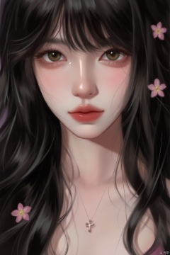 close-up shot, gazing directly at the viewer with a subtle smile. The black hair cascades down her back like a waterfall, adorned with flowers and adornments