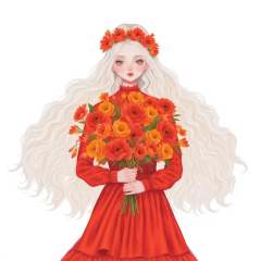 illustration in yogisya style, young woman with long white hair and a flower crown on her head. She is wearing a red dress with a high neckline and long sleeves. The dress is made of a shiny fabric and has a ruffled hemline. The woman is holding a large bouquet of red and orange flowers in her hands. The flowers are arranged in a way that they are cascading down her back, creating a beautiful and vibrant display. The background is white, making the colors of the flowers stand out even more. The overall style of the illustration is whimsical and dreamlike, <lora:yogisya:1>