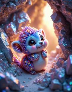 a small fat fluffy creature made of bism2 gem, whose fur is decorated with small polished crystals, which looks out curiously between two huge crystals, it holds on to the large crystals and leans forward slightly to take a close look at its surroundings, it is super cute and fluffy and looks at the viewer with big sparkling eyes, it's super cute how it looks up from the bottom, the scene takes place in a crystal cave, the walls are decorated with unpolished shiny crystals that reflect the light in the cave and everything on illuminate a harmonious and peaceful way, <lora:bism2:1>