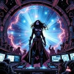 A comic book Illustration in the style of ch3co, <lora:ch3co:1>,  A space pirate queen on her cosmic flagshig, A formidable woman stands at the helm of a massive space vessel, her silhouette framed by a vast window overlooking a nebula-filled starscape. Her wild hair flows behind her, seemingly alive with crackling energy. She wears a blend of high-tech armor and flamboyant pirate attire, complete with a holographic eyepatch and a plasma cutlass at her hip. The ship's bridge is a mix of advanced technology and ornate, almost steampunk-like decorations. Alien crew members work at various stations, while holographic star charts and warnings flicker around her. The entire scene is bathed in the ethereal glow of the nearby nebula, casting dramatic shadows and highlighting the intricate details of the ship's interior