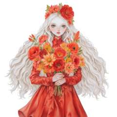 illustration in yogisya style, young woman with long white hair and a flower crown on her head. She is wearing a red dress with a high neckline and long sleeves. The dress is made of a shiny fabric and has a ruffled hemline. The woman is holding a large bouquet of red and orange flowers in her hands. The flowers are arranged in a way that they are cascading down her back, creating a beautiful and vibrant display. The background is white, making the colors of the flowers stand out even more. The overall style of the illustration is whimsical and dreamlik <lora:yogisya_x:1>