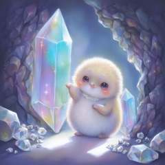 illustration in yogisya style, a small fat fluffy creature, whose fur is decorated with small polished crystals, which looks out curiously between two huge crystals, it holds on to the large crystals and leans forward slightly to take a close look at its surroundings, it is super cute and fluffy and looks at the viewer with big sparkling eyes, it's super cute how it looks up from the bottom, the scene takes place in a crystal cave, the walls are decorated with unpolished shiny crystals that reflect the light in the cave and everything on illuminate a harmonious and peaceful way,  <lora:yogisya_x:1>