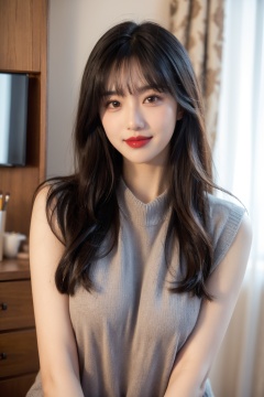 1girl, black hair, breasts, brown eyes, curtains, indoors, lips, lipstick, long hair, looking at viewer, makeup, blue,sweater, sleeveless, smile, solo, sweater, upper body