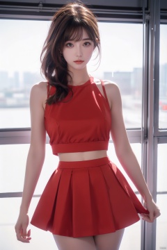 8K uhd, materpiece, a beautiful girl, detaild eye, good face, good skin, beautiful dress, red skirt, half skirt, fantacy, shining skirt, blur effect, high light, mind blowing, whole body capture,