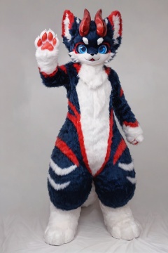 score_9,score_8_up,score_7_up,best quality,amazing quality,very aesthetic,absurdres,official art,intricate details,hyperdetailed,BRAKE,(furry:1.2),furry dragon,horns,red and black fur,furry paws,waving,standing on one leg,white background,blue eyes,furry ears,full fur suit,realistic,solo,full body,<lora:FullFurSuitPonyLora:0.9>,