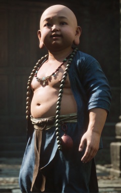 score_9, score_8_up, score_7_up, 8k, best quality, masterpiece, (ultra-detailed), solo, looking at viewer, <lora:heishenhua-pony-Tanger-000010:0.8>, smallmile, Fat kid, open clothes, jewelry, bald, solo, necklace, male focus, 1boy, by heishenhua, game cg,