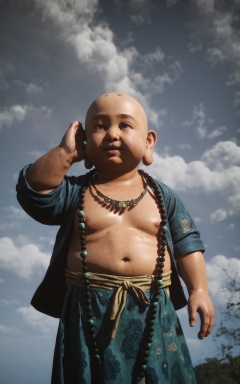 score_9, score_8_up, score_7_up, 8k, best quality, masterpiece, (ultra-detailed), solo, <lora:heishenhua-pony-Tanger-000010:0.8>, smallmile, Fat kid, open clothes, by heishenhua, game cg, jewelry, bald, solo, necklace, male focus, 1boy, cloud, outdoors, realistic, sky, cloudy sky,