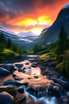 masterpiece, high quality, RAW photo, Norway, amazing nature, primeval wilderness, picturesque forest, epic sunset, bright clouds, beautiful sky, sun, desolate landscape, clean river, scenery, realistic, pristine atmosphere, photorealistic, 8K, highly detailed,
