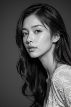Portrait of a woman with natural beauty, captured in black and white by John Byrne, soft lighting, delicate features, emotion captured in her eyes.