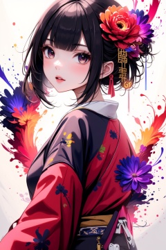 1girl, anime girl, solo, looking at viewer, colorful ink in background, ((colorful ink splash: 2)), ink everyehere, black hair, hair ornament, upper body, flower, japanese clothes, hair flower, kimono, black eyes, from side, sash, makeup, obi, lipstick, pale skin, eyeshadow, red lips, hair stick, red kimono, kanzashi, ((masterpiece: 2)), stunning image, Ink art style