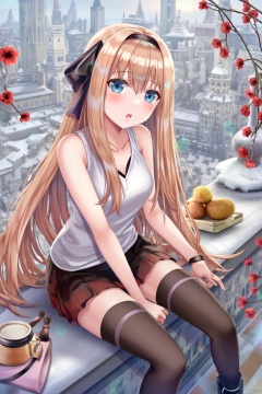 A high-quality masterpiece by artist Torino Aqua,A young girl with long hair, wearing thigh-highs and a sleeveless shirt, sits on a branch in the snow. She has very long hair, dons black thigh-highs and shoes, and holds a red flower and food. Her head is tilted, and she has black thigh-highs and grey eyes. The girl is holding a fruit and a bird, wearing a pleated skirt, white shirt, and black footwear. She has parted lips and a see-through hair ribbon. It's snowing, and the girl looks at the viewer with a surprised expression.