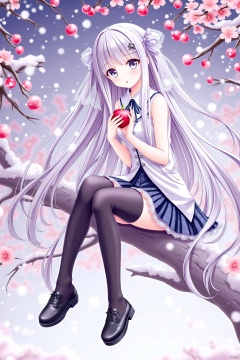 A young girl with long hair, wearing thigh-highs and a sleeveless shirt, sits on a branch in the snow. She has very long hair, dons black thigh-highs and shoes, and holds a red flower and food. Her head is tilted, and she has black thigh-highs and grey eyes. The girl is holding a fruit and a bird, wearing a pleated skirt, white shirt, and black footwear. She has parted lips and a see-through hair ribbon. It's snowing, and the girl looks at the viewer with a surprised expression.