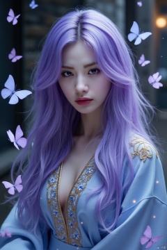 Surrounding her are delicate, luminous butterflies in shades of purple, blue, and white, which seem to be floating around her, adding to the ethereal atmosphere. The background is a softly blurred, dark, and moody setting, possibly an outdoor night scene with hints of a stone wall and a few glowing orbs, contributing to the mysterious ambiance. The texture of the fabric on her robe is smooth and slightly reflective, while the hair appears silky and voluminous. The overall color palette is dominated by cool tones, with subtle hints of warmth from the golden embroidery. The image is rich in detail and emotion, creating a mesmerizing and dreamlike experience. masterpiece, best quality, score_9, score_8_up, score_7_up,yunxi,1girl,GX-girl