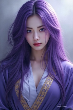 This is a highly detailed digital artwork in the fantasy genre, featuring an ethereal, otherworldly scene. The central figure is a young woman with a pale, delicate complexion and long, flowing purple hair that cascades around her face and shoulders. Her eyes are a striking violet hue, and her expression is somber yet captivating, The texture of the fabric on her robe is smooth and slightly reflective, while the hair appears silky and voluminous. The overall color palette is dominated by cool tones, with subtle hints of warmth from the golden embroidery. The image is rich in detail and emotion, creating a mesmerizing and dreamlike experience. masterpiece, best quality, score_9, score_8_up, score_7_up,yunxi,1girl,GX-girl