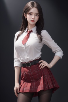 masterpiece,best quality,official art,extremely detailed CG unity 8k wallpaper,realistic,light rays,light particles,1girl,solo,skirt,pantyhose,plaid skirt,black hair,long  hair,pantyhose,standing,day,(simple background:1.2),necktie,dynamic pose,looking at viewer,cowboy shot,breasts,hand on hip,belt,lips, <lora:jk美女:0.8>