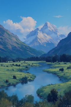 A serene landscape: A vast blue sky stretches above a range of majestic mountains, their rugged peaks shrouded in wispy clouds. In the valley below, a winding river flows gently, its calm surface reflecting the cerulean heavens. The scene is set against a backdrop of lush greenery, with trees and bushes scattered across the terrain.