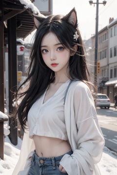 white theme, 1girl,anime girl, solo, nice girl, the perfect face, snow-white hair, the hair is slightly shaggy, hair over one eye, hairstyle with a side parting, voluminous hair, lush hair, long hair, snow-white skin, blue eyes,red lips,cat ears,black jeans, black crop top, white jacket, located on the street, model pose, sharp focus, perfect hands, perfect face, perfect eyes, perfect light, dynamic light, natural light