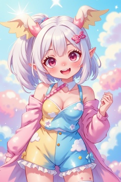 "kawaii, cute, adorable woman with pink, yellow, and baby blue color scheme. She is dressed in sky-themed clothes made out of clouds and sky motifs. Her outfit is fluffy and soft, with decora accessories like hairclips. She embodies the vibrant and trendy Harajuku fashion style." White hair, red eyes, horns, demon wings, big ,big ass, big lips, juicy lips, huge hair, smile pastelmix,kidz