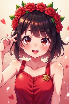 (masterpiece),(best quality:1.0), (ultra highres:1.0), detailed illustration, 8k, anime, 1girl, beautiful girl, wearing a red dress, flower crown, pretty face, detailed face, beautiful eyes, detailed eyes, dark red eyes, bright red lips, red lipstick, beautiful stylish hair, highlights in hair, bangs anime style, best quality, vibrant