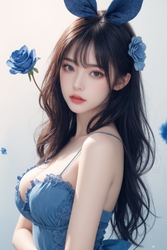 1girl, artist name, bangs, bare shoulders, blue bow, blue flower, blue nails, blue rose, bow, breasts, bunny, flower, heart, long hair, looking at viewer, medium breasts, nail polish, pink bow, rose, solo, sparkle, star \(symbol\), stuffed animal, stuffed toy<lora:eye:0.8>