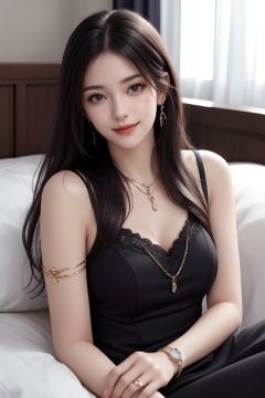 1girl, bed, black hair, bracelet, dress, jewelry, lips, long hair, looking at viewer, pillow, realistic, sitting, smile, solo, watch, wristband, wristwatch <lora:jk美女:00.8>
