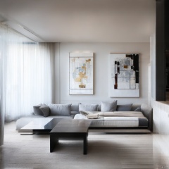 A modern living room with a cozy sofa and a low coffee table, abstract art paintings hanging on the wall, minimalist decor in whites and greys, natural light pouring through floor-to-ceiling windows, high-quality picture of a contemporary interior design, sharp focus, detailed textures.,fangzi